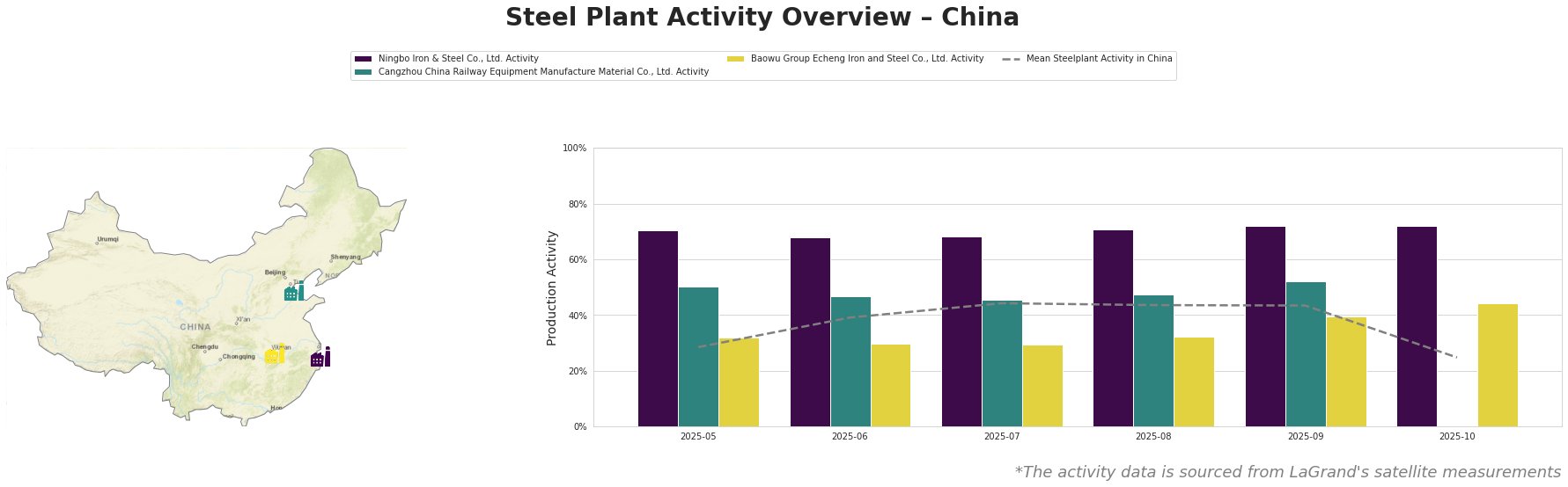 Ningbo Iron & Steel Co., Ltd., a BOF-based integrated steel plant in Zhejiang with a 4000ktpa crude steel capacity, has shown consistently high activity levels. From May to October 2025, the activity remained high, between 68% and 72% suggesting stable and strong production. The company holds Responsible Steel Certification. The high and stable activity levels at Ningbo, producing finished rolled products, including automotive structural steel and electrical steel, contrast with the broader push for carbon reduction, highlighting a need for careful monitoring of this plant’s future carbon emissions strategy in line with articles “Cop: EU, China join Brazil in carbon market coalition” and “EU and China join Brazil in carbon market coalition“.