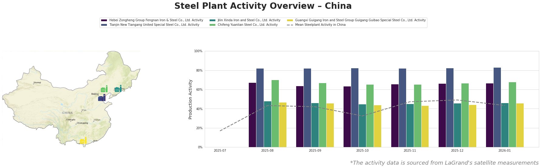 Plant activity reflects a fluctuating landscape, with overall mean activity dropping from 49% in December 2025 to 43% in January 2026. Specifically, Hebei Zongheng has lately shown strong resilience, peaking at 67% activity, while Jilin Xinda trails with a drop to 46%, showing no clear connection to any recent news developments.