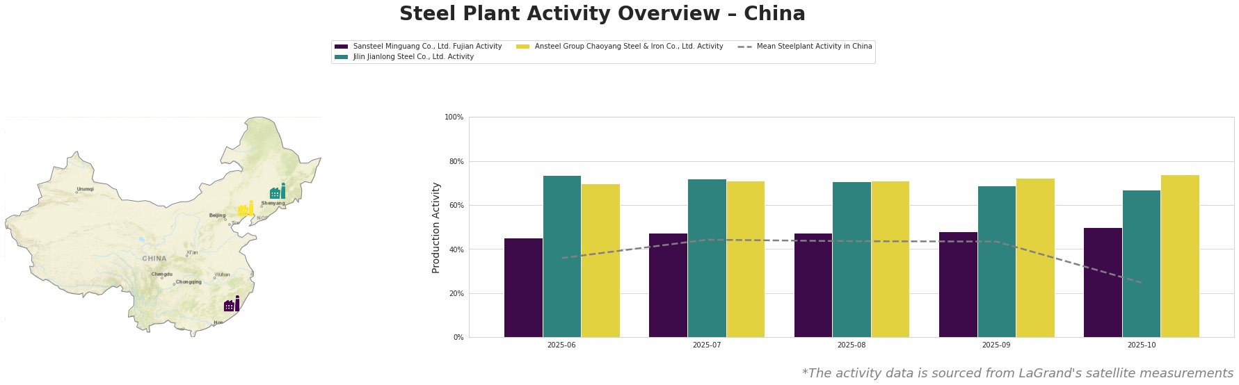 Sansteel Minguang Co., Ltd. Fujian, an integrated BF-based steel plant with a crude steel capacity of 6.8 million tonnes, mainly produces finished rolled products such as steel plates, round bars, and construction steel. Observed activity rose from 45% in June to 50% in October, contrasting the sharp drop in mean activity levels across China, but aligning with their focus on construction steel. The increase might reflect a strategic emphasis on maintaining production for key infrastructure projects, however a direct causal link cannot be established.