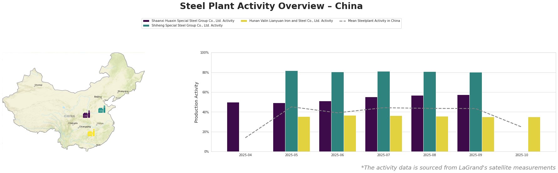 Shaanxi Huaxin Special Steel Group Co., Ltd., an EAF-based plant with a capacity of 1.2 million tons producing rolled round steel plate and hot-rolled rebar, shows consistently above-average activity. Activity increased steadily from 50% in April to 58% in September. No data is available for October. No direct connection between these activity levels and the provided news articles can be established.
