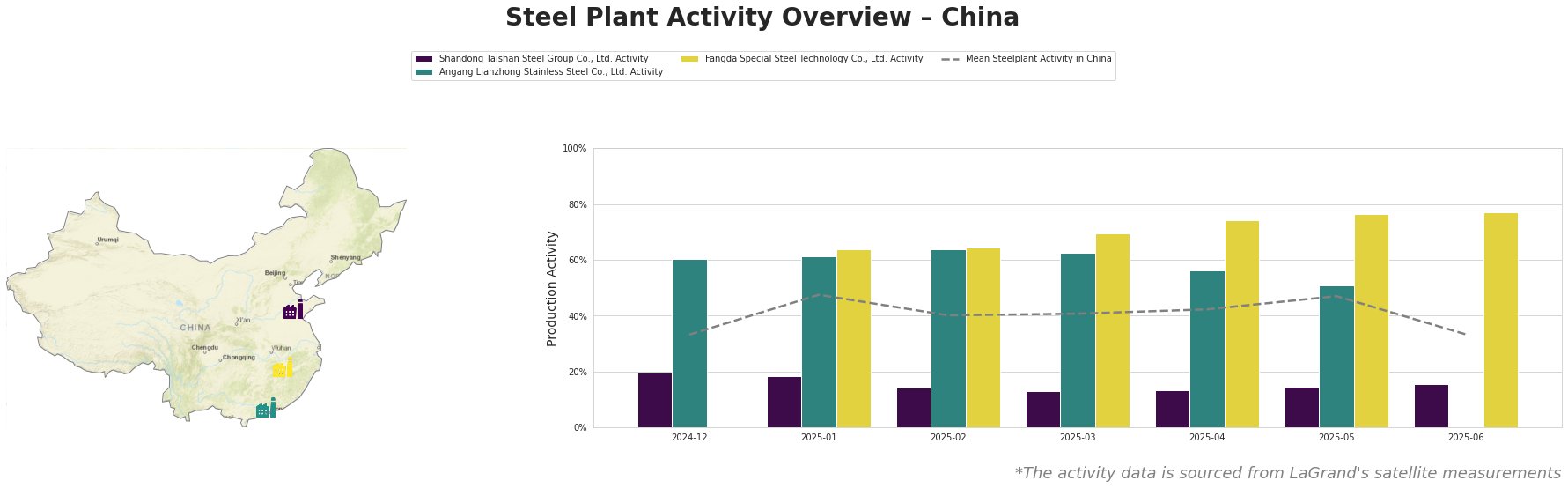 Shandong Taishan Steel Group Co., Ltd., an integrated steel plant with a crude steel capacity of 5000ktpa, relying on BF/BOF processes alongside an EAF, has consistently shown activity levels far below the Chinese average. The plant’s activity remained very low, fluctuating between 13% and 20% throughout the observed period, and reached 16% in June. The company produces finished rolled products, including hot and cold-rolled coil and stainless steel. Given the consistently low activity, a direct connection to the general market uncertainty discussed in “Assofermet: Italian steel market remains uncertain in May amid growing concerns” is plausible, though not definitively provable based solely on the provided data. This could be due to low demand for hot/cold rolled coil and stainless steel.