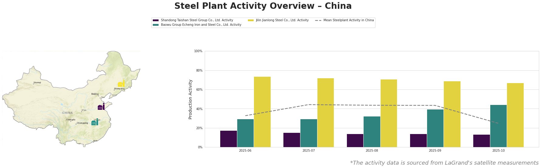 Jilin Jianlong Steel Co., Ltd.: Jilin Jianlong Steel Co., Ltd., an integrated plant producing automotive and pipeline steel with a crude steel capacity of 3000 TTPA, exhibited consistently high activity, declining gradually from 74% in June to 67% in October. While decreasing, it remains significantly above the average Chinese steel plant activity. These activity levels do not show a clear relationship with the named news articles.