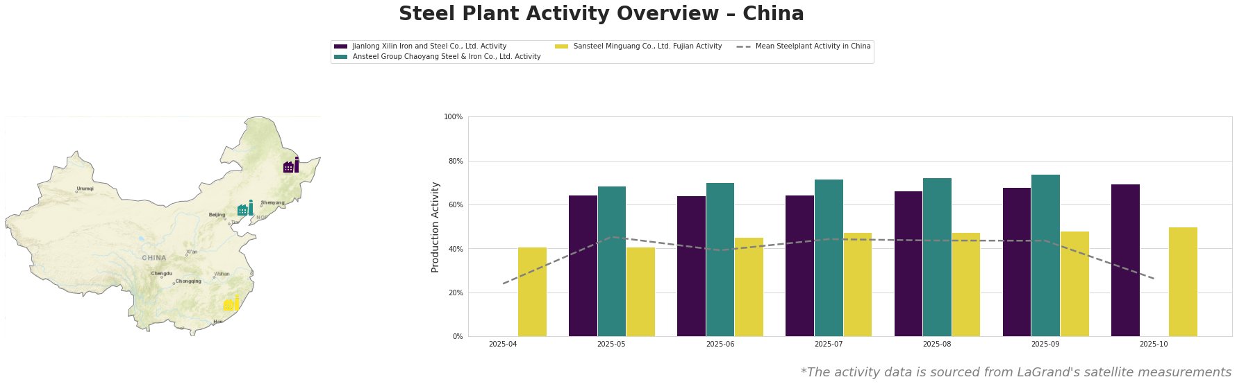 Based on “China increased steel exports by 9.2% y/y in January-September” and the consistently high activity levels observed at Jianlong Xilin Iron and Steel Co., Ltd., despite a drop in the mean activity in October, steel buyers should anticipate stable supply from this region for construction grade steel, and railway products. Procurement specialists may consider prioritizing Jianlong Xilin for supply contracts, as its sustained high activity suggests reliable output. However, the overall drop in the mean production should be considered, keeping the option open to also procure from other regions/plants.