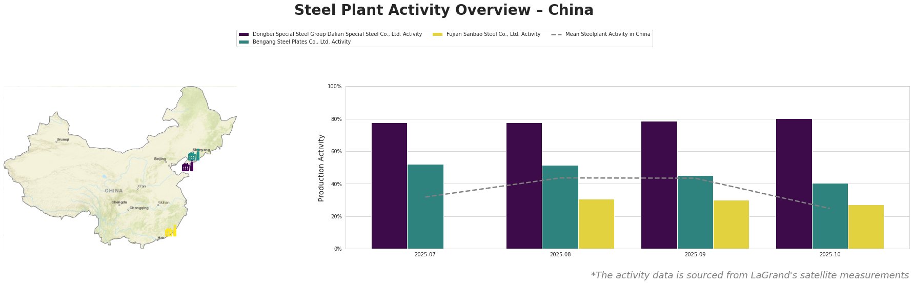 Activity at Dongbei Special Steel remained high, with peak levels of 80% in October, although it dropped to 25% mean activity overall by the end of October, indicating instability. There is no explicit connection to the EV trade disputes.