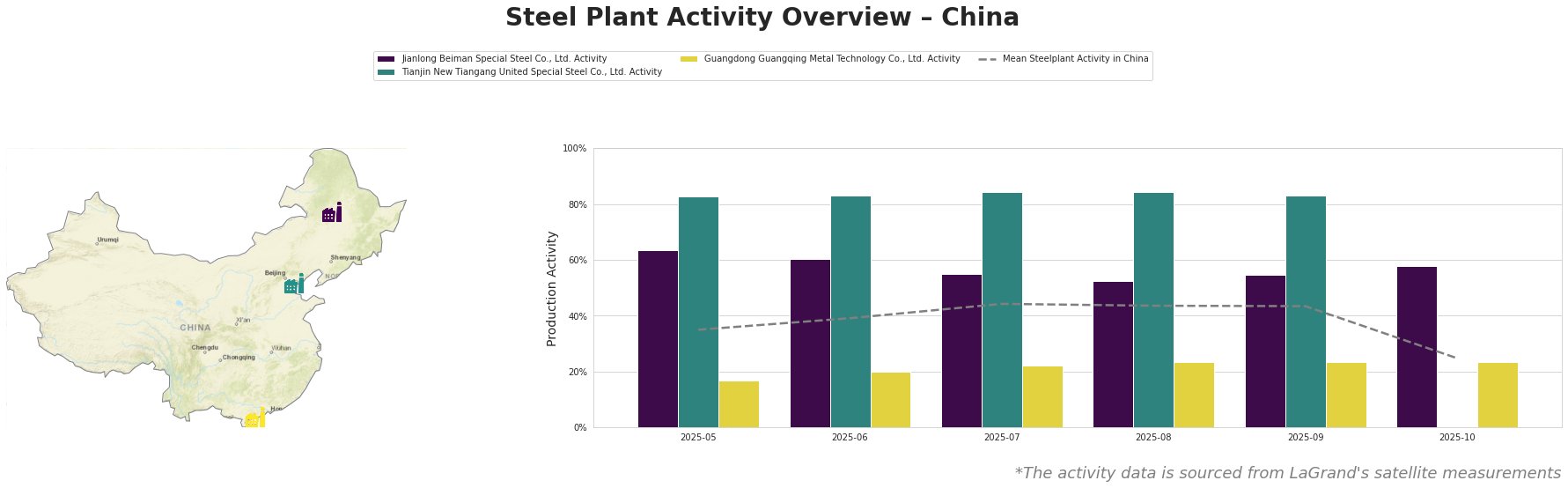 Jianlong Beiman Special Steel Co., Ltd., located in Heilongjiang, operates as an integrated steel plant with a crude steel capacity of 2200ktpa, producing semi-finished and finished rolled products like continuous casting round billet, stainless heat-resistant steel, tool steel, and bearing steel, using BF, BOF, and EAF technologies. Its activity levels have remained relatively stable, fluctuating between 53% and 63% across the observed months, ending at 58% in October, indicating consistent production despite global market shifts. No direct connection between the EU trade measures discussed in the news articles and the activity of this plant can be established.