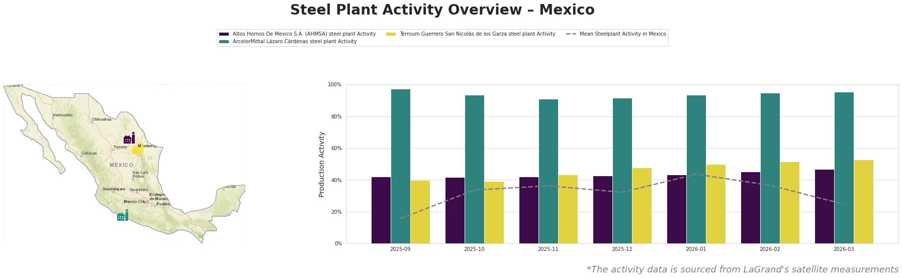 The overall mean activity of steel plants saw a stark decline to 25% in March 2026 from 44% in January, indicating a significant downturn. AHMSA observed a rise to 47% in March from 43% in January, whereas ArcelorMittal Lázaro Cárdenas and Ternium Guerrero showed stability at 95%. However, the mean activity remains markedly low, and particularly concerning is the persistent 23-month contraction in the manufacturing sector as cited in “Mexico factory contraction extends into Feb”.