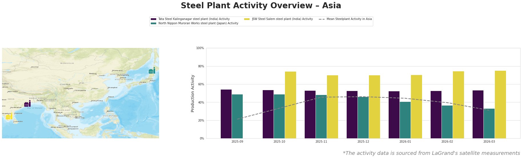 Tata Steel Kalinganagar, maintaining at 53% capacity across the observed timeline, shows stability amidst market turmoil, but overall activity levels are low given the mean of 31%. North Nippon Muroran Works has seen fluctuations but declined to 33% by March 2026, correlating with global market downturns as stated in European steel production hits historic low.” JSW Steel Salem experienced slight increases, peaking at 75% in February 2026, yet remains vulnerable to the impacts described in the news articles, related to high energy costs and import pressures.