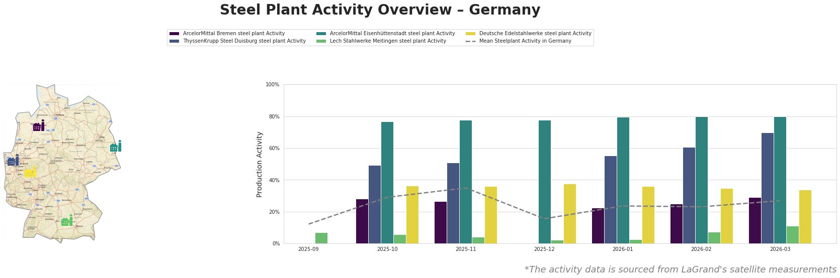 Bar chart and satellite map of steel production activity in Germany