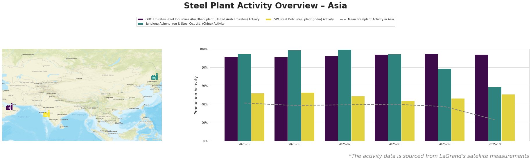 As evidenced by satellite-observed data, average steel plant activity in Asia plummeted to 23% by October 31, 2025, a sharp decline from 37% in September. Notably, the GHC Emirates Steel Industries Abu Dhabi plant and Jianglong Acheng Iron & Steel Co., Ltd. have observed activity drops to 94% and 59% respectively, the latter reflecting a 20% decrease since September, directly correlating with heightened operational costs due to rising oil prices without a corresponding increase in demand aligned with Trump’s Sanctions narrative. Meanwhile, JSW Steel Dolvi steel plant remained relatively stable at 51%, likely indicating resilience amidst increasing operational pressures.