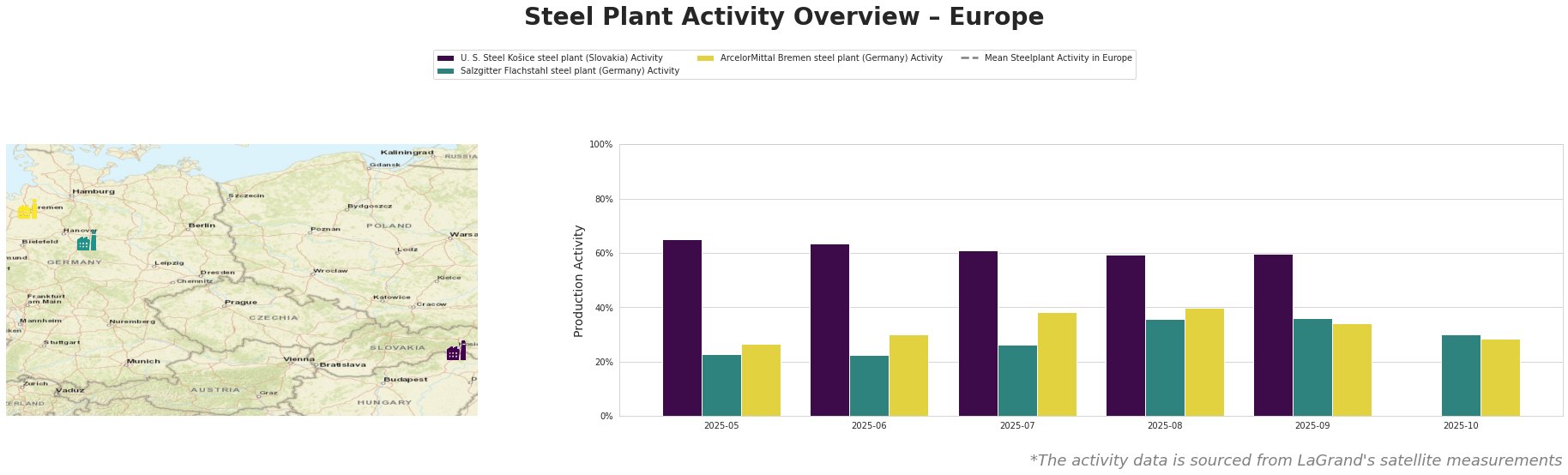 ArcelorMittal Bremen, another German integrated steel plant with a 3.8 million tonne BOF capacity producing primarily flat rolled products, showed a steady increase in activity from 27% in May to 40% in August, followed by a decrease to 34% in September and 29% in October. Like U.S. Steel Košice and Salzgitter Flachstahl, the observed decline in activity at ArcelorMittal Bremen from August through October has no explicit connection to the provided news.