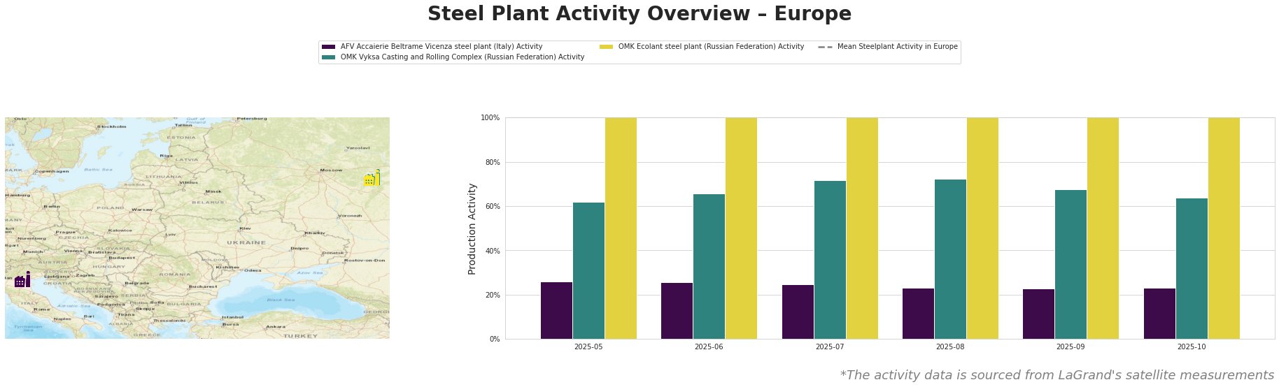The mean steel plant activity in Europe shows variability, peaking in July/August 2025 and dropping to its lowest level in October. AFV Accaierie Beltrame Vicenza steel plant has the lowest overall activity and shows a slight decline in the period from May to October. OMK Vyksa Casting and Rolling Complex exhibits the highest activity levels and a general increase until July/August. OMK Ecolant steel plant activity is constant across all months.