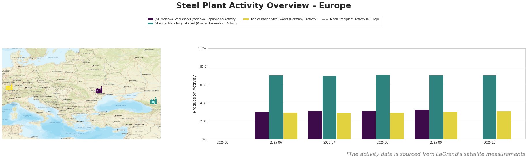 JSC Moldova Steel Works, an electric arc furnace (EAF) plant with a 1 million tonne crude steel capacity producing wire rod, rebar, and billet, shows relatively stable activity levels between June and September, ranging from 30% to 33%. These levels are significantly below the European mean steel plant activity. No direct link between these activity levels and the provided news articles could be established.