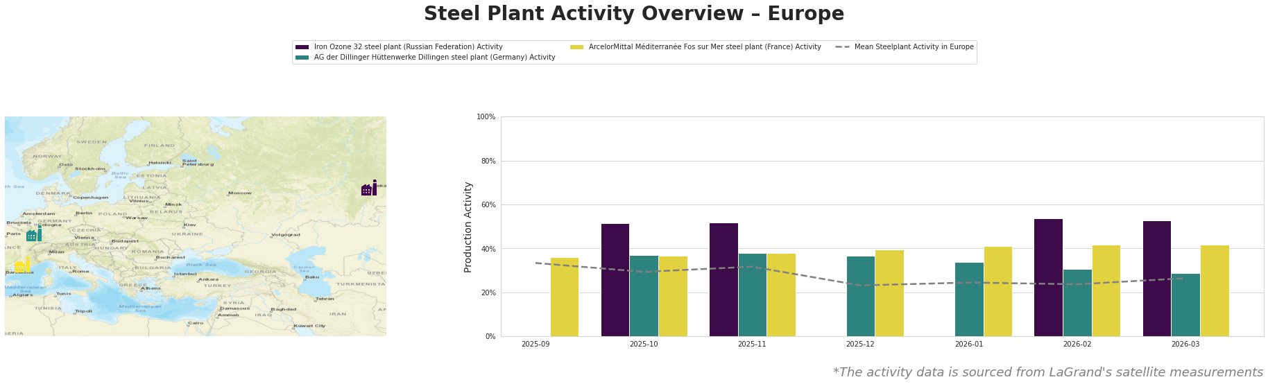 Meanwhile, the ArcelorMittal Méditerranée Fos sur Mer steel plant has sustained a consistent operational baseline, keeping activity at 42% in both February and March 2026, following a modest increase from 39% in December 2025. Again, this stability does not link with external events, signaling resilience within its operational strategies.