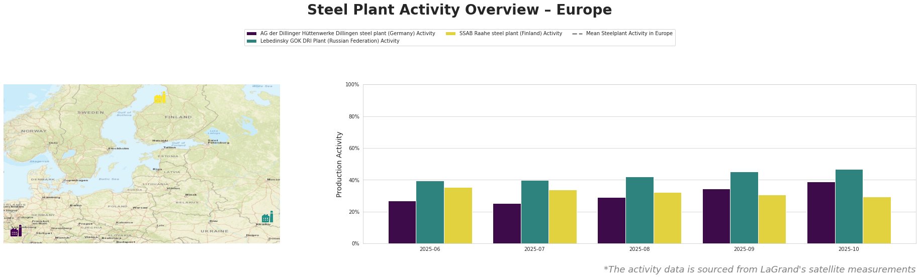 The mean steel plant activity in Europe has fluctuated, dipping to 271853108.0 in October 2025. AG der Dillinger Hüttenwerke Dillingen steel plant exhibits a steadily increasing activity from 27.0 in June to 39.0 in October. Lebedinsky GOK DRI Plant shows a similar upward trend, reaching 47.0 in October. Conversely, SSAB Raahe steel plant’s activity has decreased from 36.0 in June to 29.0 in October.