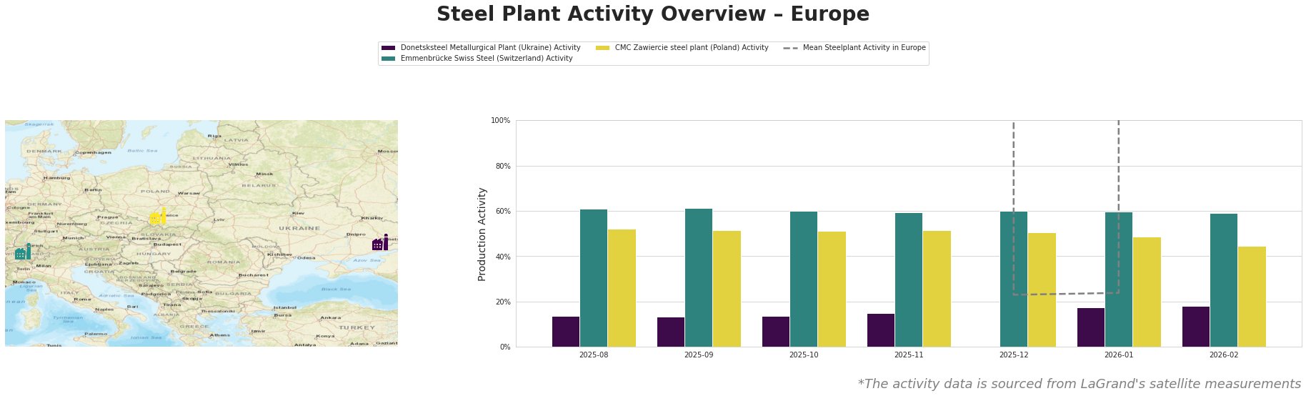 Bar chart and satellite map of steel production activity in Europe