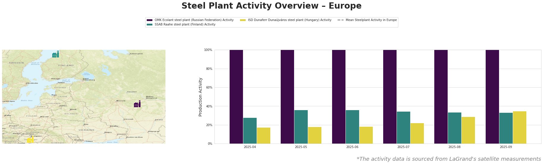 The mean steel plant activity in Europe fluctuated significantly, ranging from approximately 5.2E9 to 7.0E9. OMK Ecolant consistently registered very high activity levels. SSAB Raahe experienced a rise from 28% in April to 36% in May and June, before slightly decreasing to 33% in September. ISD Dunaferr showed a steady increase in activity from 17% in April to 35% in September. There is no directly attributable link between these observed activities and the news articles, as no plant is explicitly mentioned in them other than through future developments.
