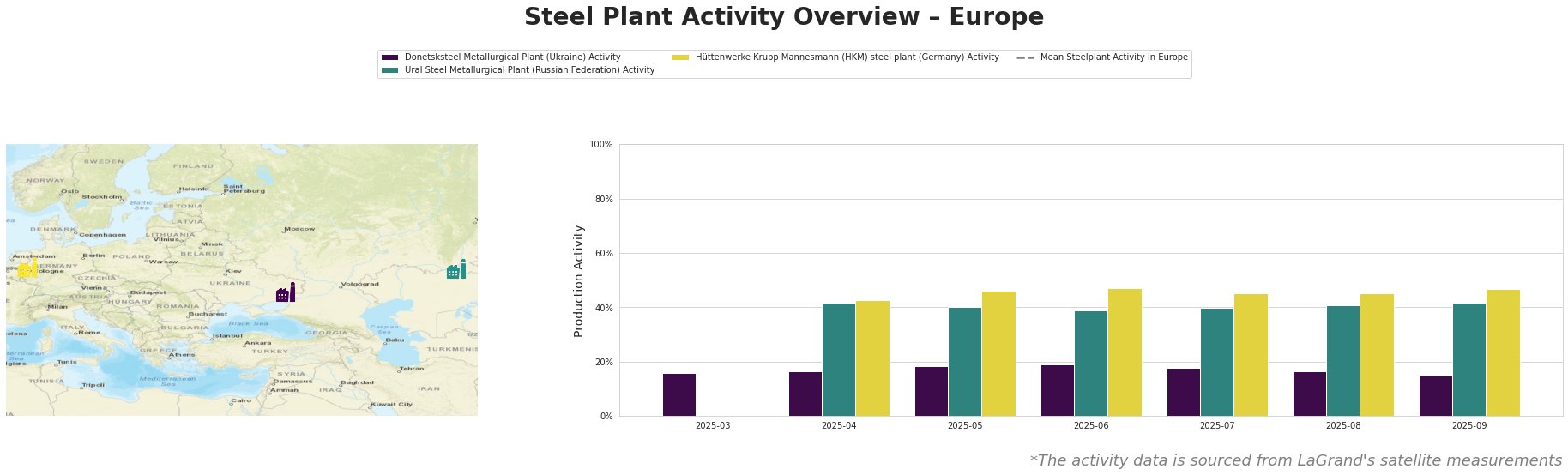 Hüttenwerke Krupp Mannesmann (HKM) steel plant in Germany, also operating an integrated (BF) process and BOF technology, experienced relatively stable activity between 43% and 47% during the observed period, peaking in June and September 2025. HKM produces crude, semi-finished, and finished rolled steel products. The HKM plant has a crude steel capacity of 6000 ttpa. Given the overall German decline in steel production reported in “Germany reduced steel production by 10.5% y/y in August” and “German crude steel output down 11.9 percent in January-August 2025“, the relatively stable observed activity at HKM warrants closer scrutiny to assess its potential impact on regional supply dynamics.