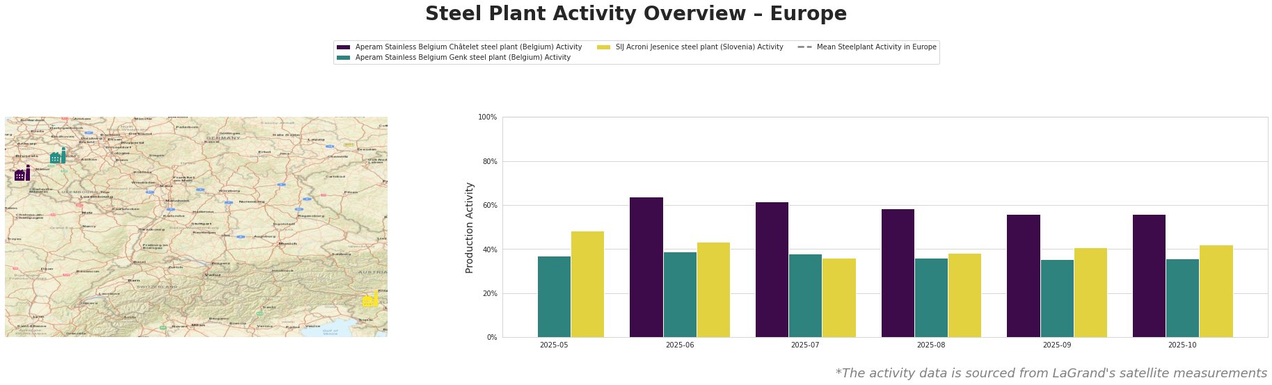 Bar chart and satellite map of steel production activity in Europe