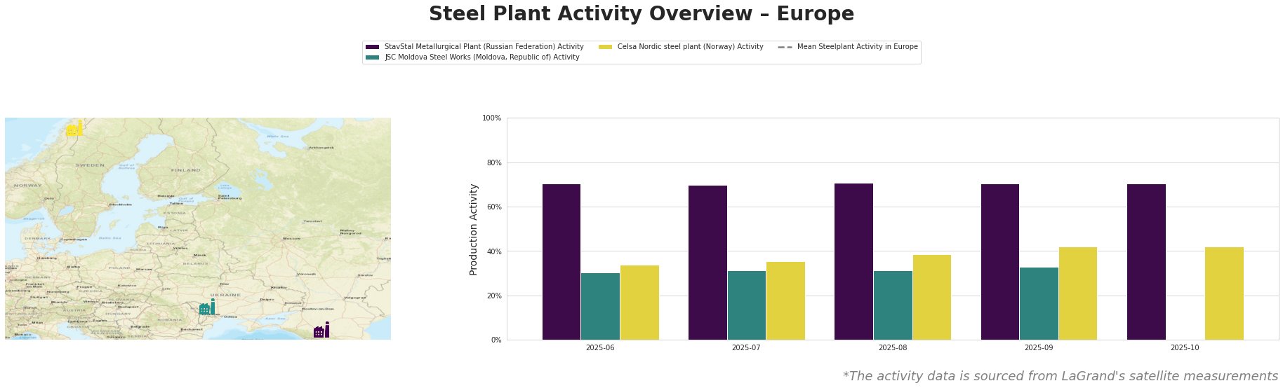 StavStal Metallurgical Plant (EAF-based, 500kt crude steel capacity, located in Stavropol Krai, Russia, focusing on semi-finished and finished rolled products like rebar and wire rod) activity remained relatively stable at around 70-71% between June and October 2025. This stability occurs despite news of European price increases (“ArcelorMittal raises prices for long products in Europe by €30/t“) and CBAM-related uncertainty, but no direct link can be established as this is a Russian plant.