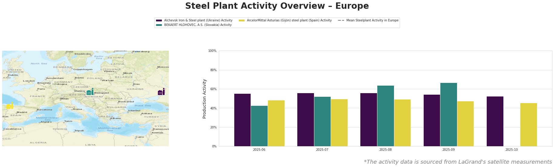 Alchevsk Iron & Steel plant, located in the Luhansk region of Ukraine with a crude steel capacity of 5472 ttpa, has shown a moderate decrease in activity from 55% to 52% between June and October. Being an integrated plant reliant on BF/BOF technology and producing primarily semi-finished and finished rolled products, the facility’s output could be affected by regional instability. No direct relationship could be established between the observed activity levels and the provided news articles.