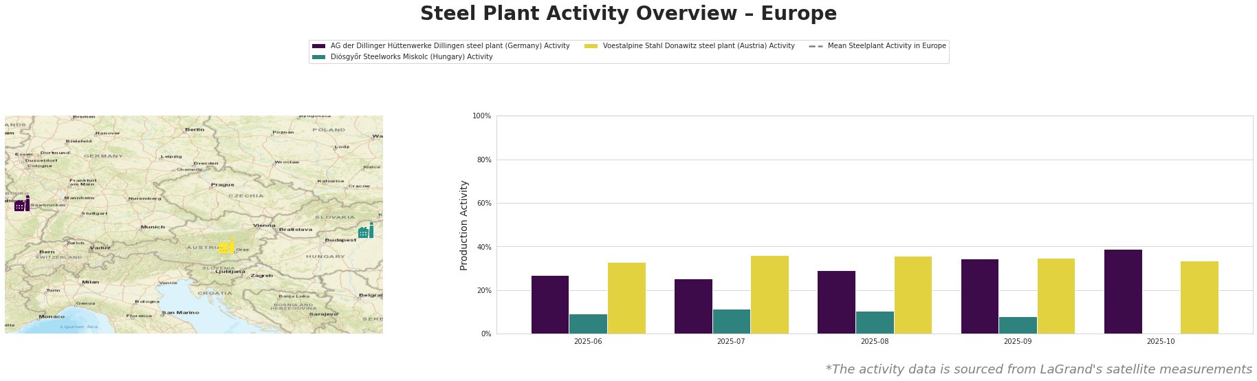 The table shows fluctuating activity levels across the observed steel plants. The Mean Steelplant Activity in Europe generally decreased from June to October. AG der Dillinger Hüttenwerke Dillingen steel plant (Germany) saw a steady increase from 27.0% in June to 39.0% in October. Diósgyőr Steelworks Miskolc (Hungary) showed variable activity, peaking at 12.0% in July and then showing no data for October. Voestalpine Stahl Donawitz steel plant (Austria) maintained relatively stable activity, fluctuating between 33.0% and 36.0%.