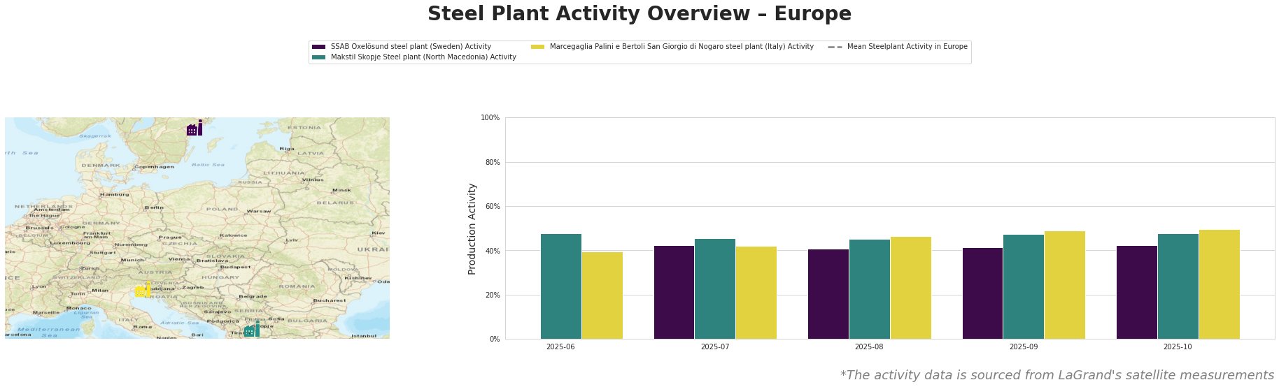 Bar chart and satellite map of steel production activity in Europe
