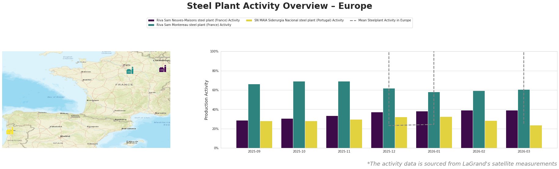 The Riva Sam Montereau steel plant experienced fluctuating activity, peaking at 69% in October but declining to 61% by March. The plant’s operations have been under pressure amid rising costs and a cautious market approach, as noted in “European rebar suppliers return to market with higher prices.” This downturn signals direct impacts from the weak construction sector highlighted in multiple articles.
