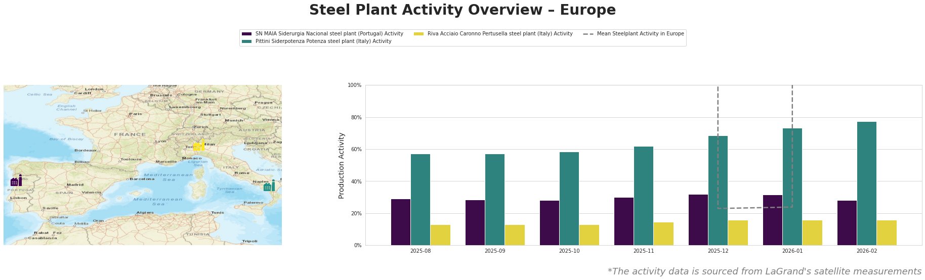 The SN MAIA Siderurgia Nacional steel plant in Porto shows fluctuating activity, peaking at 73.0% in January 2026, aligning with elevated demand for rebars as noted in the positive market sentiment. Despite a later decrease to 28.0% in February, this variance reflects the market’s current dynamics as detailed in the respective articles.