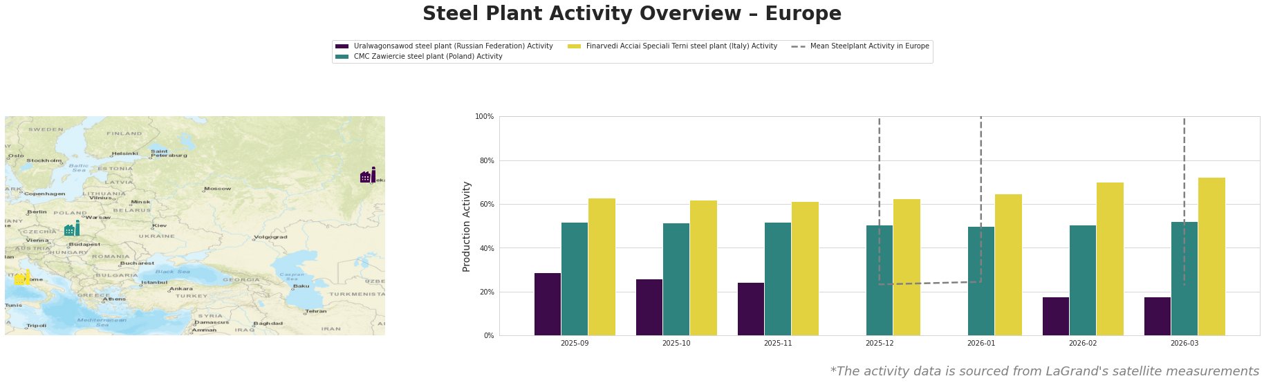 Activity levels in Europe have seen a severe drop, with a significant plunge observed in the Uralwagonsawod steel plant, which declined from 29% to 18% between February and March 2026. This aligns with the overarching narrative of reduced operational capacity discussed at the EUROMETAL meeting, alongside the challenges placed by climate regulations. CMC Zawiercie and Finarvedi, though less impacted relative to Uralwagonsawod, displayed only minor fluctuations, indicating a more stable but still concerning environment, corroborating calls from Italy, France push EU for faster ETS, CBAM reforms to protect industry (2026-03-05).