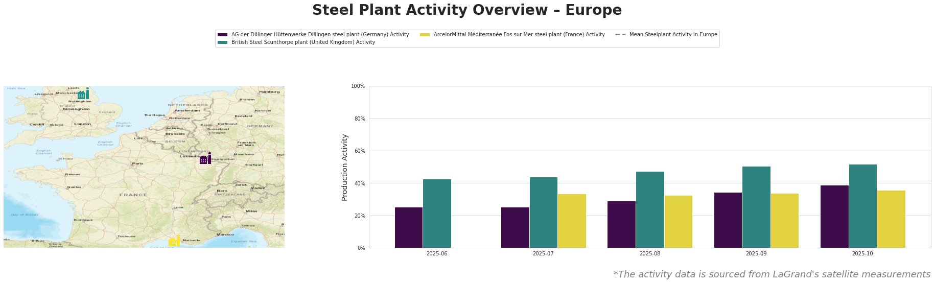 Activity levels show a strengthening trend, with the British Steel Scunthorpe plant reaching a notable peak of 52% in October, suggesting robust demand and operational resilience. The AG der Dillinger Hüttenwerke plant experienced a rise to 39% in October, albeit starting from a lower base. The Fos sur Mer facility has maintained steady yet lower activity, indicative of preparation for potential future challenges.