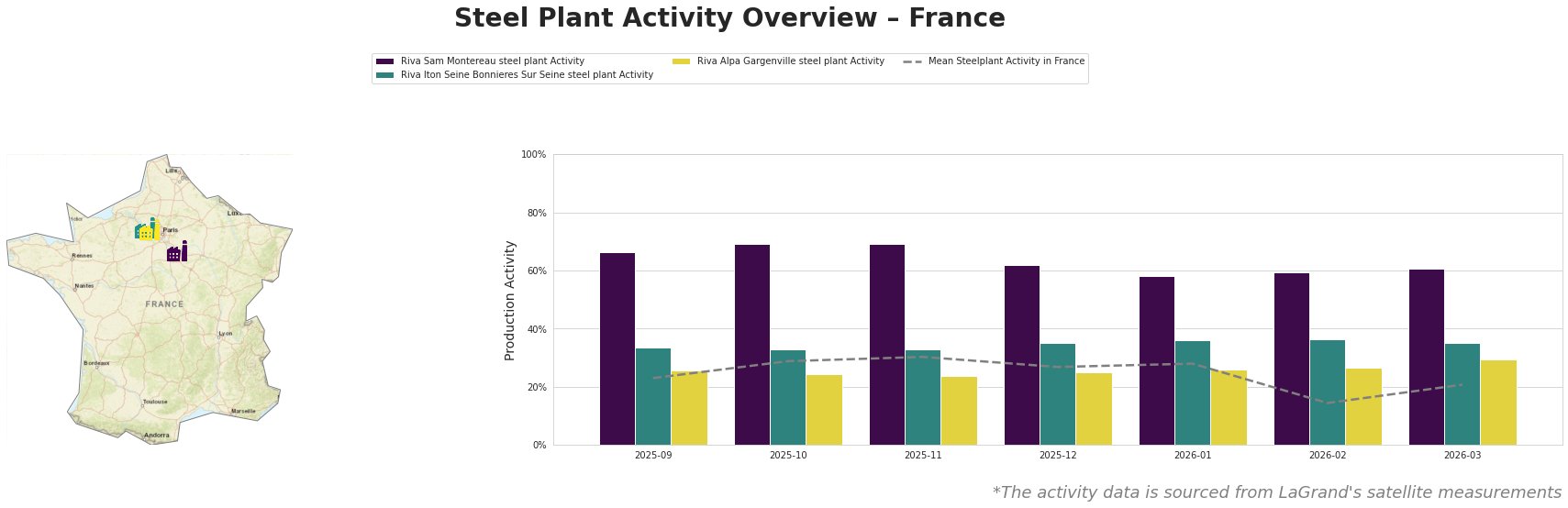 Bar chart and satellite map of steel production activity in France