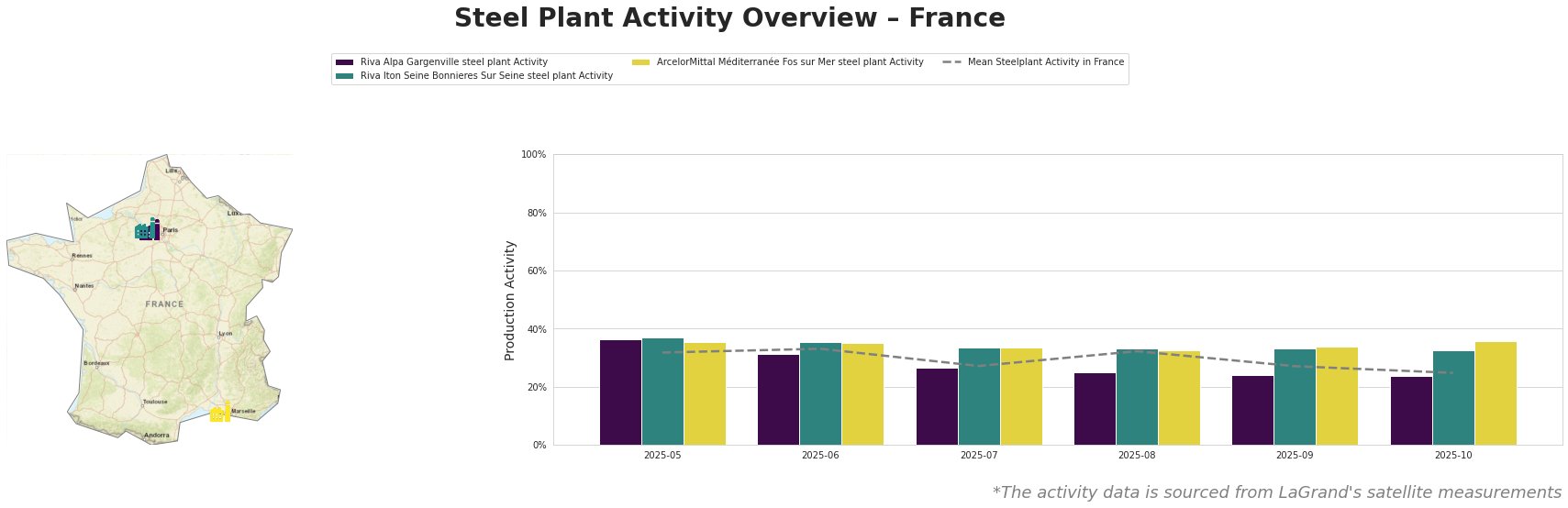 Overall, the mean steel plant activity in France has shown a declining trend, reaching 25.0% in October 2025, the lowest level in the observed period.