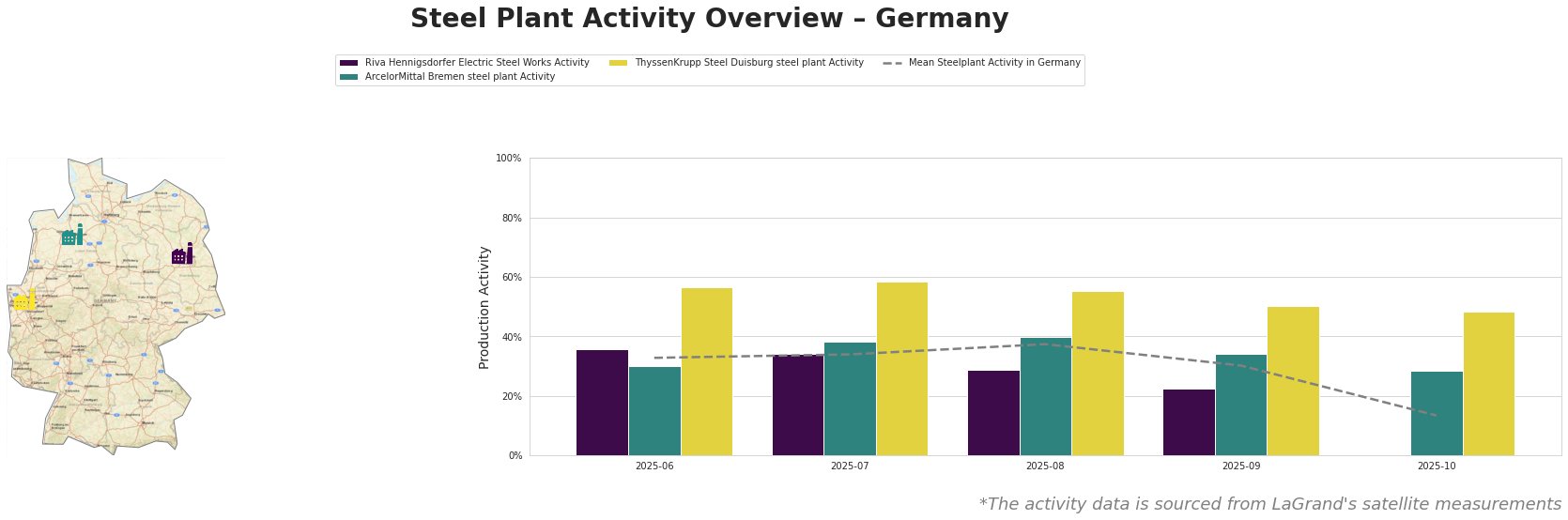 ArcelorMittal Bremen steel plant, an integrated BF-BOF plant with a 3,800kt crude steel capacity, produces finished rolled products such as hot and cold rolled coils, serving the automotive, building, and energy sectors. The plant’s activity peaked in August (40.0%) before declining to 29.0% in October. This decrease could be linked to the automotive industry downturn mentioned in “Autobranche: Zahl der Beschäftigten erreicht Tiefstand seit Mitte 2011“.