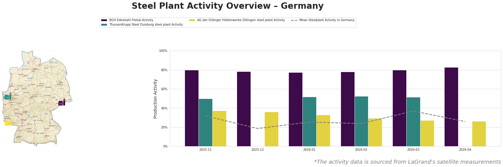 Activity levels at steel plants exhibit stark variation. BGH Edelstahl Freital experienced stable activity, peaking at 83% in April 2026, which shows resilience amidst industry declines but with no direct link to the discussed news articles. ThyssenKrupp’s activity fluctuated around the mid-50% mark, indicating some operational steadiness but unable to match historical utilization. The AG der Dillinger Hüttenwerke’s activity dropped to 26% in April 2026, a notable decline reflecting the broader market malaise.