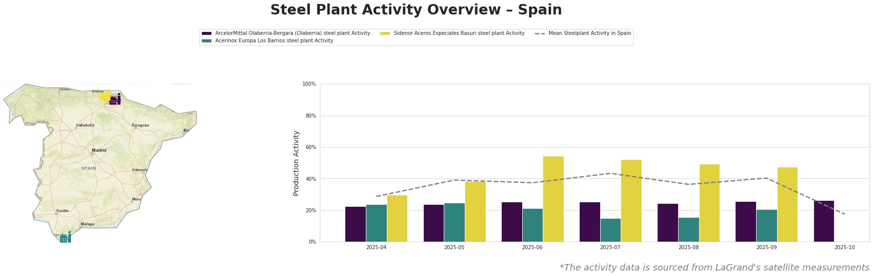 Bar chart and satellite map of steel production activity in Spain