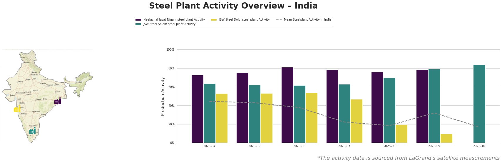 Overall, the mean steel plant activity in India shows a declining trend, dropping from 44% in April to 17% in October. Neelachal Ispat Nigam steel plant has maintained a relatively high and stable activity level throughout the observed period. JSW Steel Salem steel plant has generally increased activity levels, peaking at 84% in October. JSW Steel Dolvi steel plant saw a significant drop in activity, reaching a low of 10% in September and lacking activity data in October. No direct connections between the activity level changes and the named news articles can be established.