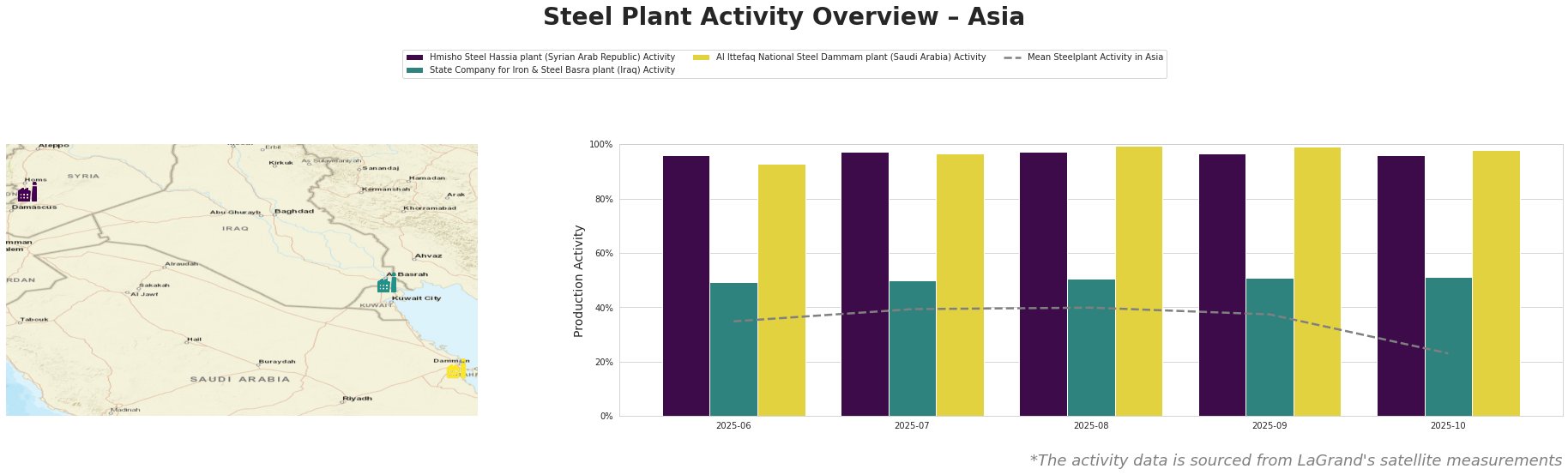 Al Ittefaq National Steel Dammam plant, situated in the Eastern Province of Saudi Arabia, also maintains very high activity levels, nearing or reaching 100%. This integrated (DRI-EAF) plant, with a crude steel capacity of 1 million tons per year and a pelletizing capacity of 2.5 million tons, produces semi-finished products. The stable high activity contrasts the overal Asian drop in october. There is no apparent impact from, or direct connection to, the developments described in the named news articles.