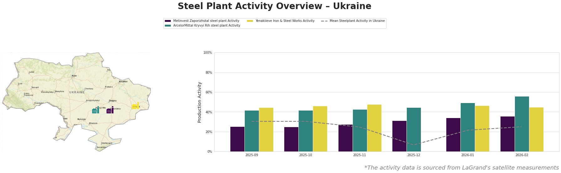 In Ukraine, significant changes in the steel market are emerging amidst ongoing geopolitical challenges. Recent news articles shed light on production and export dynamics: “Ukraine reduced its exports of long rolled steel by 62% y/y in January“ and “Ukraine increased ferroalloy production by 17% y/y in 2025.” These developments correspond to observed satellite data indicating steady but cautious activity levels across major steel plants.