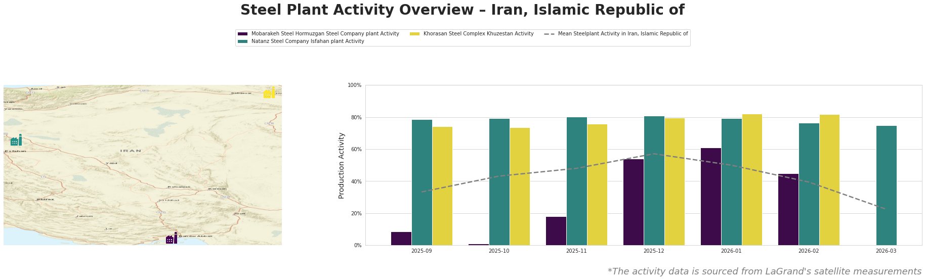 Bar chart and satellite map of steel production activity in Iran, Islamic Republic of