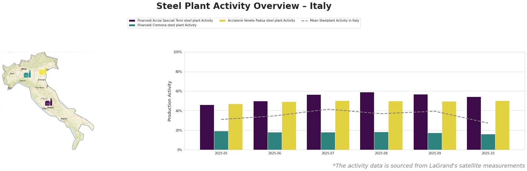 Located in the Province of Terni, this plant boasts a crude steel capacity of 1,450 ttpa using exclusively electric arc furnaces (EAF). The plant produces semi-finished and finished rolled products including stainless steels intended for automotive, construction, and transport. While the activity level remained above the mean and highest of the measured plants, a gradual decrease was observed from a high of 59% in August 2025 to 54% in October 2025. No direct connection between this activity trend and the news articles about Marcegaglia could be established.