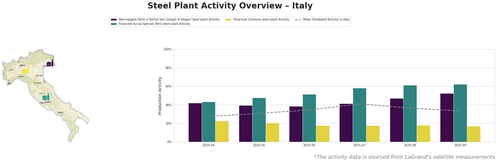 The mean steel plant activity in Italy has generally increased from 28% in April to 33% in September, with a peak of 41% in July, indicating a growing trend.