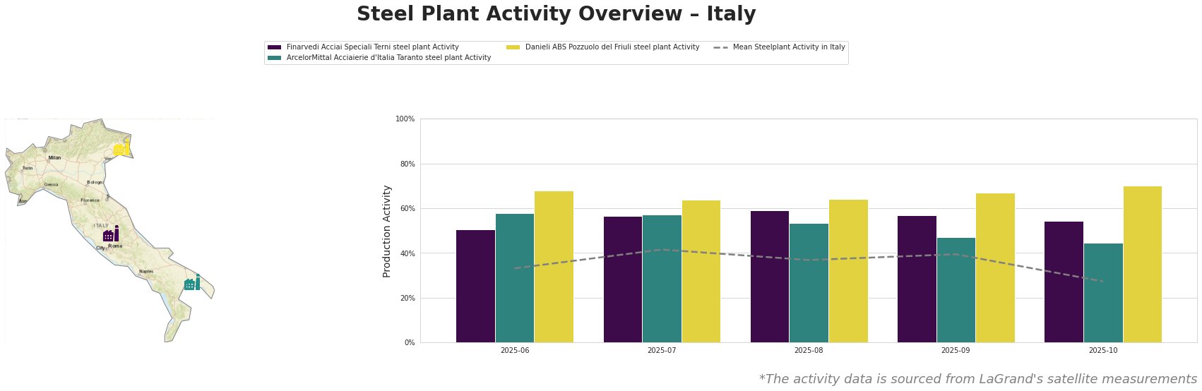 Italy’s steel market presents a mixed picture. While “Italy increased steel production by 6% m/m in October” and “Italian crude steel production up 2.2 percent in October 2025” suggest a positive production trend, “Italy’s apparent consumption is declining, Germany’s trade balance is becoming scarce” raises concerns about domestic demand and export prospects. The observed satellite data shows a significant activity drop in October despite increased steel production, further complicating the outlook, but no direct relationship between production increase and activity drop can be established.