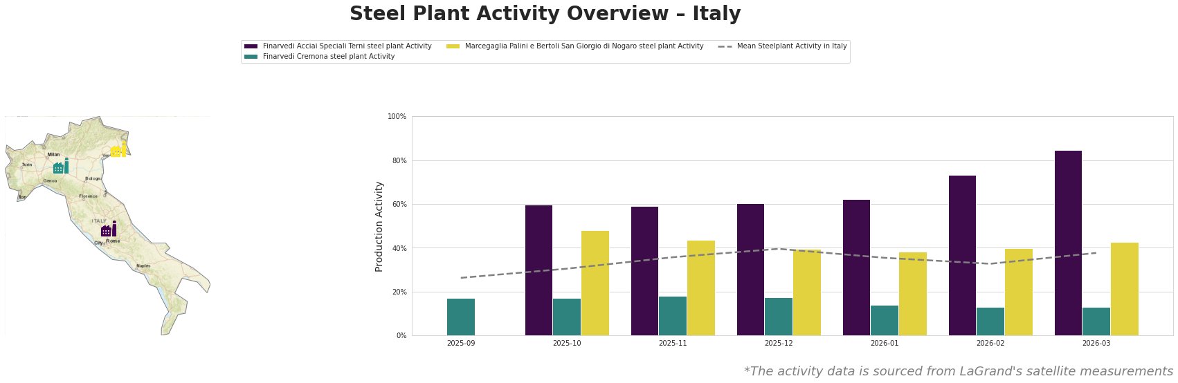 The Finarvedi Acciai Speciali Terni plant showcases the most favorable activity, peaking at 85% in March 2026, aligning with insights from “European coil and green steel round-up”, indicating a robust demand amid higher coil prices ranging from EUR690-700/t. This sustained activity underscores a transition towards increased domestic production as import barriers and costs constrict supply. The steady rise from 60% in October to this peak suggests that the facility, which specializes in a variety of steel products including hot and cold-rolled materials primarily using electric arc furnaces (EAF), is well-positioned to meet increasing local demand.