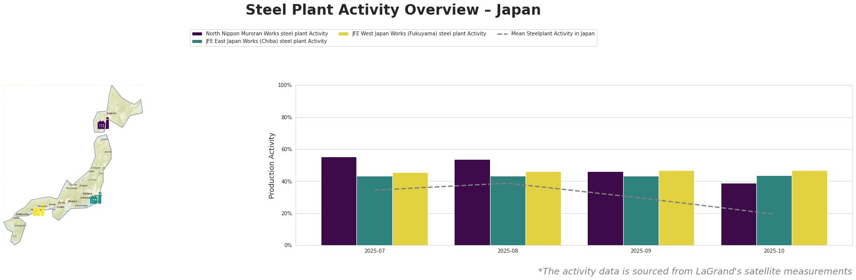 The North Nippon Muroran Works steel plant has seen a steady decrease in activity from 55% in July to 39% by October, contrasting sharply with the declining mean activity across all observed plants dropping to 19%. This substantial 29% decline in activity can be linked to the overall downward trend in Japan’s steel exports and domestic demand for crude steel, as noted in “Japan’s steel demand outlook on Q1 2026 signals 1.6 percent decline.”