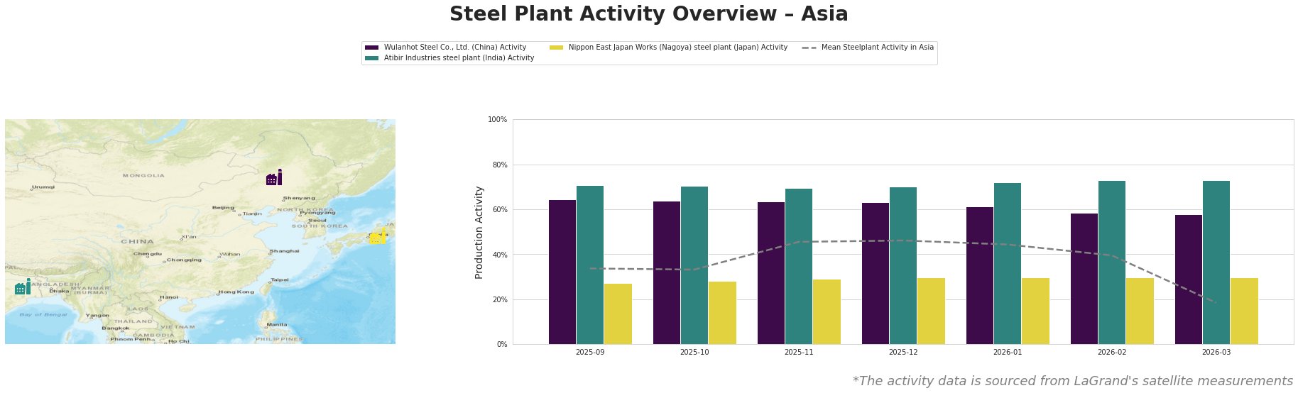 Bar chart and satellite map of steel production activity in Asia