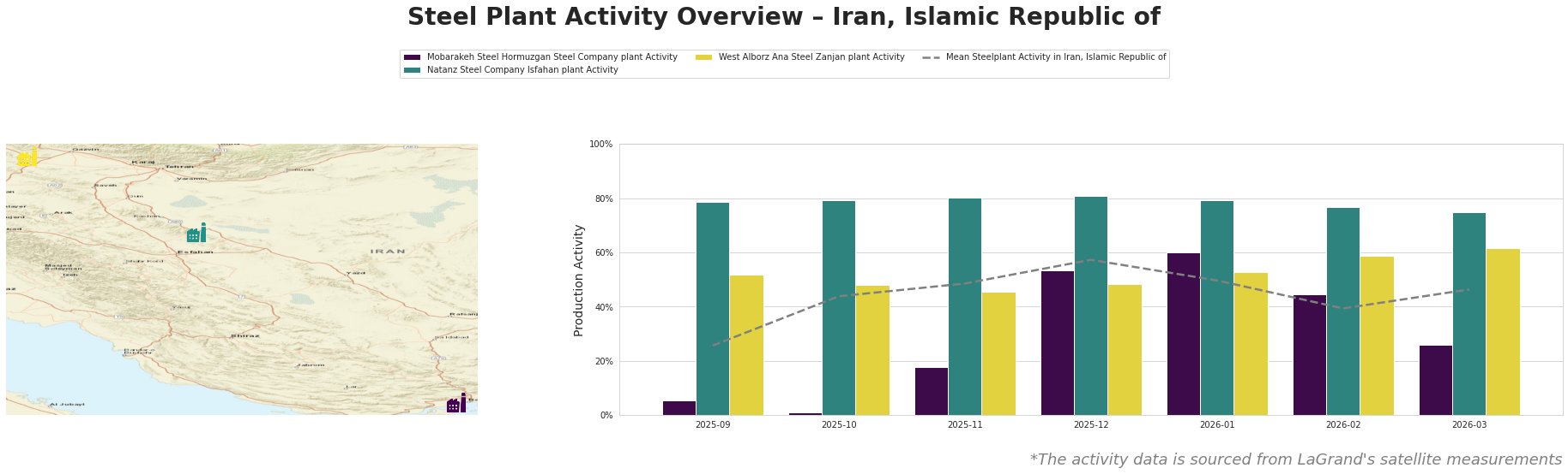 For West Alborz Ana Steel in Zanjan, activity remained somewhat stable at around 62.0% in March 2026, despite regional instability concerns. This stability may not shield against future fluctuations, as escalating operational costs tied directly to crude oil prices (noted at nearly $105/barrel) could impact overall production dynamics across Iranian steel plants.