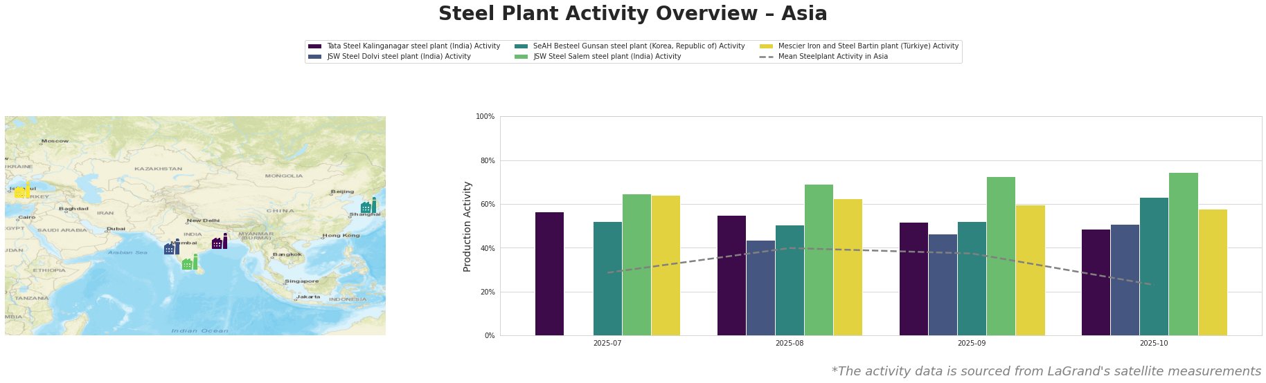 Bar chart and satellite map of steel production activity in Asia