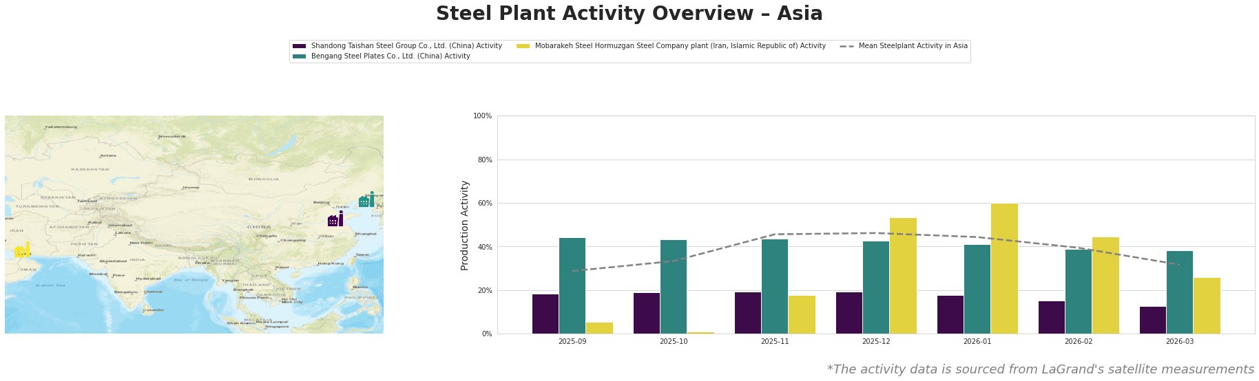 Bar chart and satellite map of steel production activity in Asia
