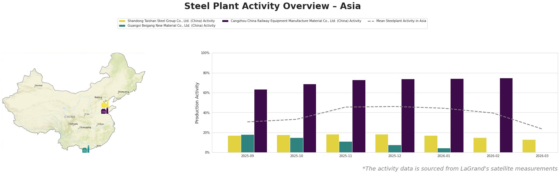 Bar chart and satellite map of steel production activity in Asia