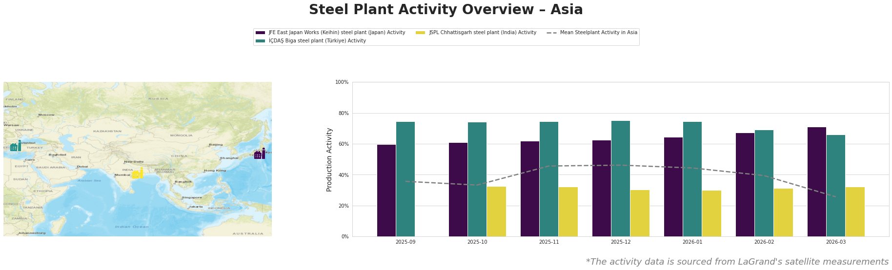 The mean steel plant activity in Asia observed a substantial decline to 26% by March 2026, falling from a previous high of 46% in November 2025. The JFE East Japan Works (Keihin) maintained a relative peak activity of 71% as late as March 2026, which will likely be impacted by the ongoing issues outlined in “Japan’s Mitsubishi Chemical slows ethylene production” as naphtha supply concerns affect broader industrial output and potential steel feedstocks. Meanwhile, İÇDAŞ Biga saw a drop to 66%, stable but worrying in light of the regional pressures from low methanol supply impacting construction steel demand.